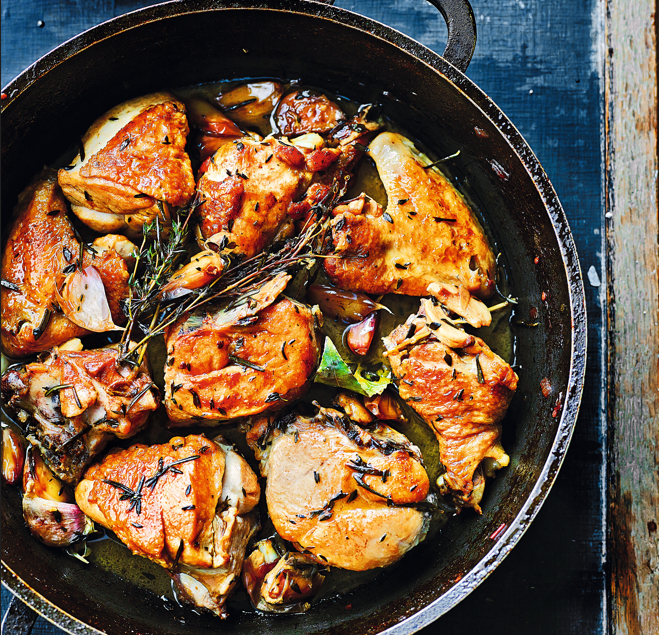 This wonderfully aromatic chicken dish is short on prep and big on flavour. It's also a great dish to make ahead the day before and reheat — it's even tastier after the flavours meld. Seared chicken on the bone, slow cooked onions & whole cloves of garlic finished with white wine, rosemary & tender, roasted new potatoes.
